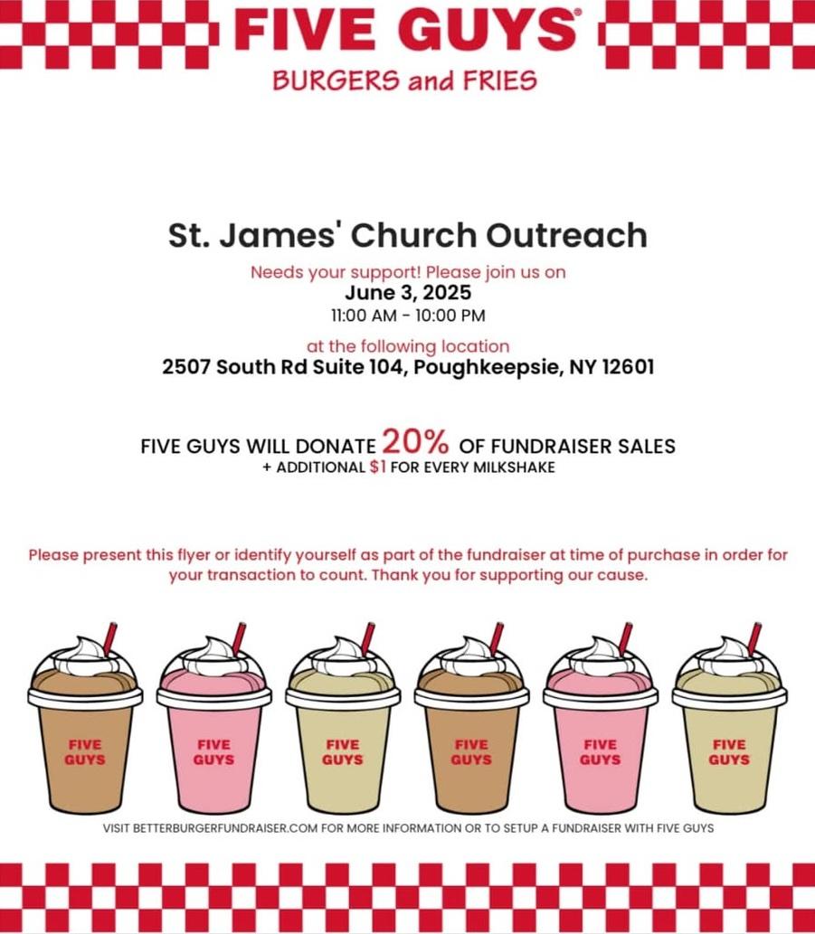 Visit Five Guys Burgers and Fries (2507 South Road, Poughkeepsie) on Tuesday, June 3rd from 11 am to 10 pm and mention St. James’ Outreach—Five Guys will donate 20% of your order to our outreach ministries, plus an additional $1 for every milkshake ordered!