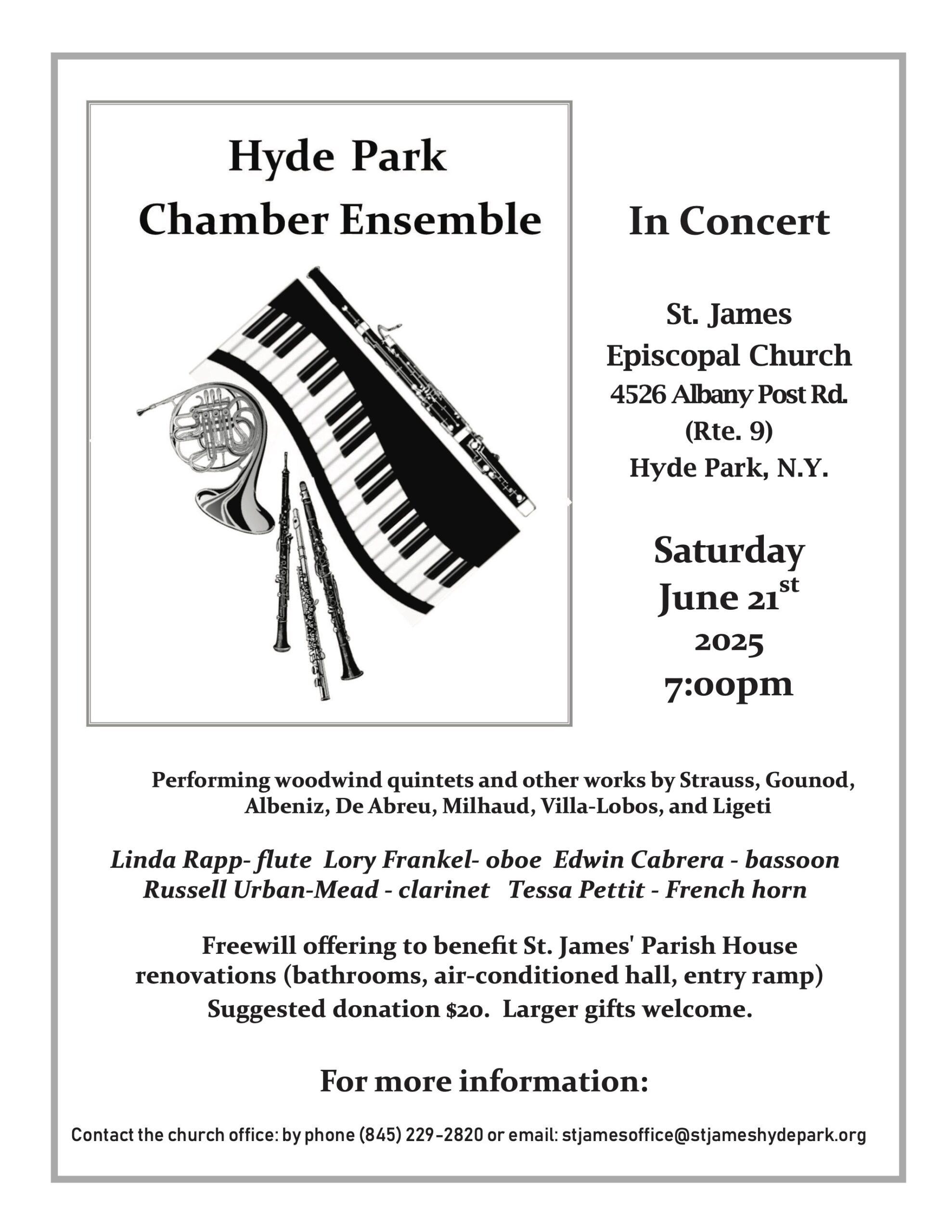 Enjoy a delightful evening of music in our Parish Hall with the Hyde Park Chamber Ensemble, a woodwind quintet featuring our own Russell Urban-Mead on clarinet. Proceeds will benefit upcoming improvements to our Parish House, including creation of a handicap-accessible bathroom.
